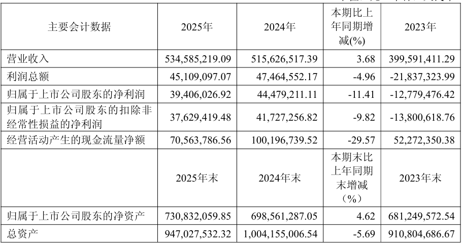 4月27日,广东富信科技股份有限公司正式发布2025年年度报告。年报显示,2025年富信科技实现营业总收入5.35亿元,同比增长3.68%;归属于上市公司股东的净利润3940.6万元,同比下降11.41%;经营活动产生的现金流量净额7056.38万元。