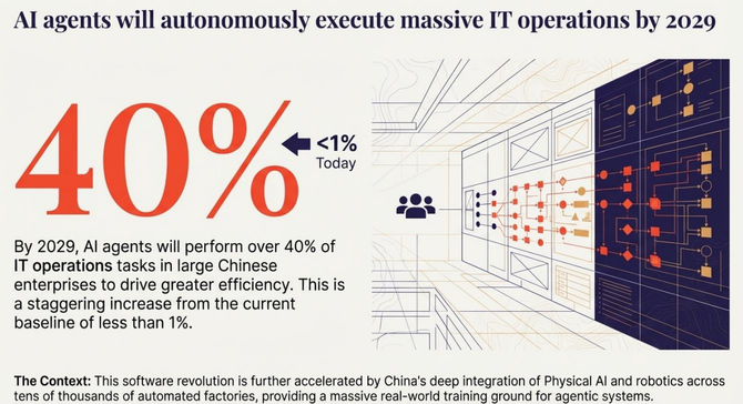 四是自主运营:预计到2029年,大型中国企业40%的IT运维任务将由AI智能体完成(目前不足1%),AI智能体可通过对话式交互提升运维效率,但关键节点仍需人工介入,企业需逐步建立人机协作框架。