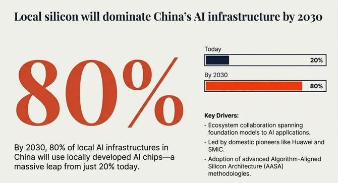 一是硬件自主:受美国芯片出口限制影响,中国正全力推进AI芯片自主化,预计到2030年,80%的本土AI基础设施将采用国产芯片(目前仅20%)。部分中国企业已具备替代全球领先厂商的芯片设计能力,算法与芯片深度协同的AASA架构成为本土芯片主流方向。