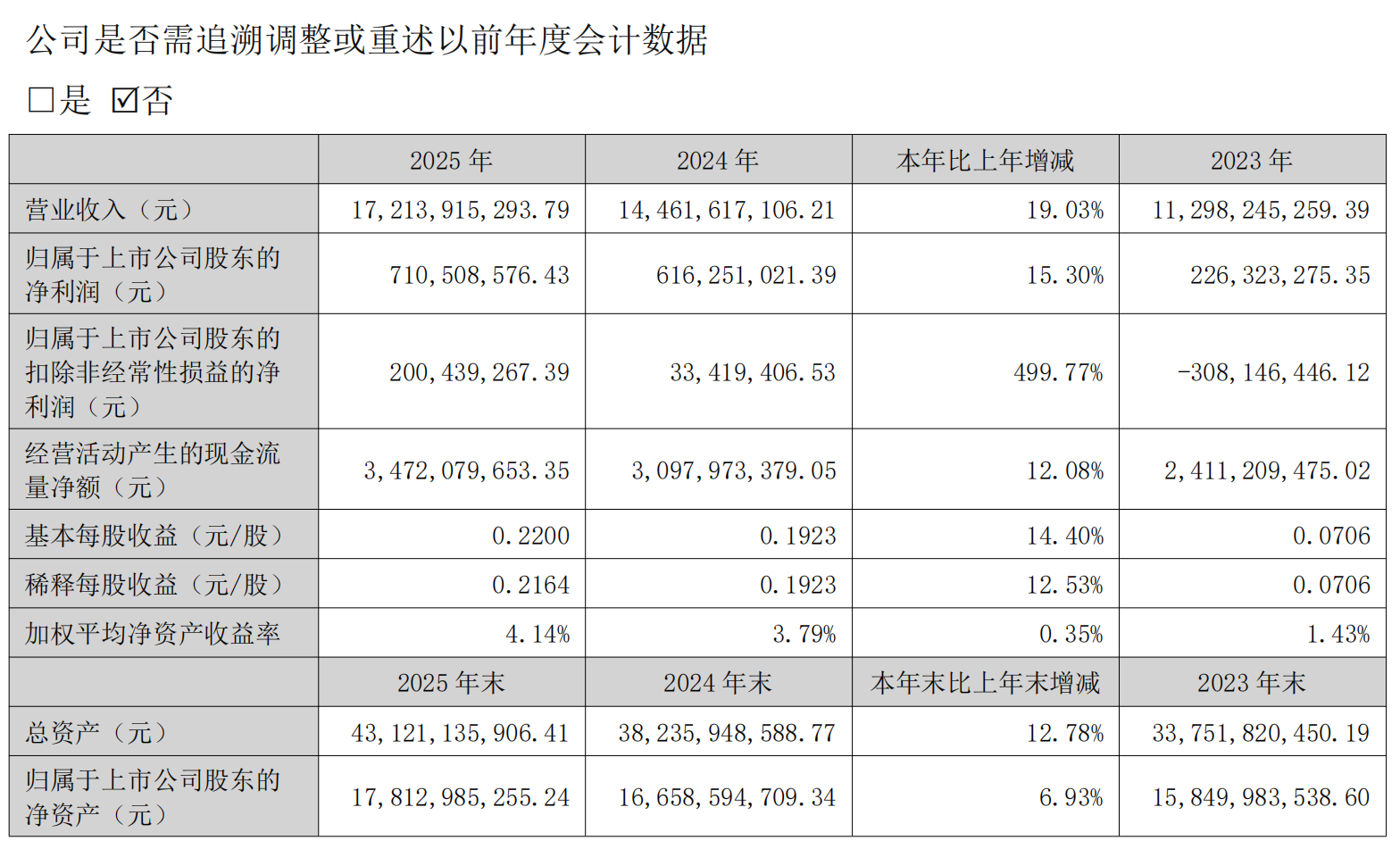 3月31日,华天科技发布2025年年度报告。2025年公司全年实现营业收入172.14亿元,同比增长19.03%;归属于上市公司股东的净利润7.11亿元,同比增长15.3%,基本每股收益0.22元。公司拟以权益登记日股份总数为基数,向全体股东每10股派发现金红利0.22元(含税),不进行资本公积转增股本。