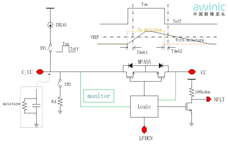 艾为的PD PHY系列芯片内部集成拥有专利保护的硬件水汽检测电路,并将其融入到toggle过程中,其原理结合下图解释: