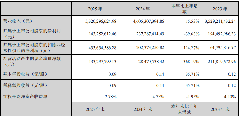 经营活动产生的现金流量净额为1.33亿元,同比增长368.19%,回款能力显著改善。加权平均净资产收益率为2.78%,扣非后净资产收益率达8.42%。