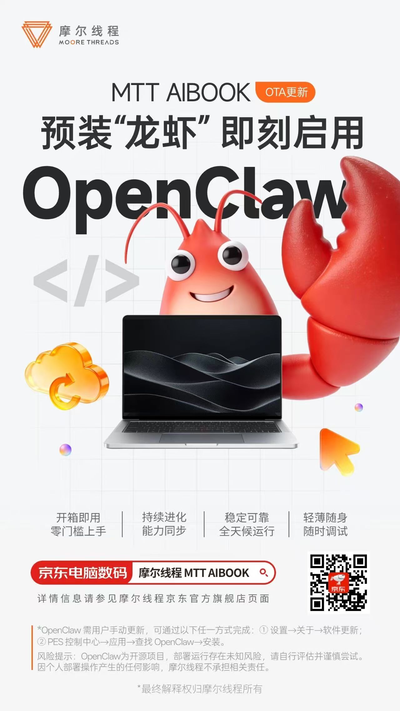 近日,摩尔线程MTT AIBOOK通过OTA推送MT AIOS 1.3.4版本更新,预装OpenClaw。
