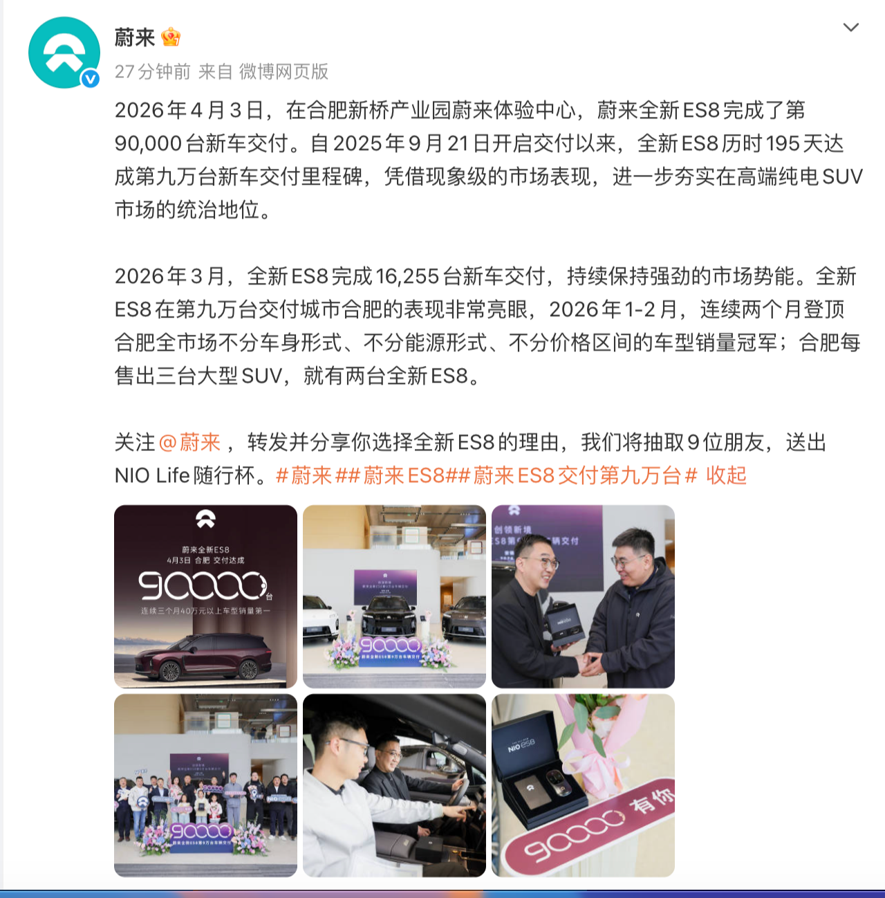 蔚来全新ES8完成第90000台新车交付 历时195天