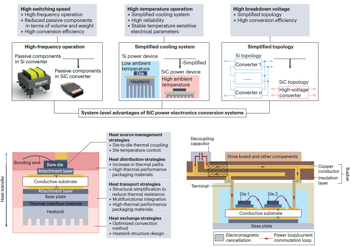随着智能电网、航空航天、能源开发等领域对电能变换系统效率与功率密度要求的不断提升,作为核心器件的功率半导体正加速向宽禁带材料方向发展。与传统硅器件相比,碳化硅功率器件具有更高的工作频率与更高的效率,并能够在更高电压与更高温度条件下稳定运行,为电力电子系统实现高效率、高可靠与高功率密度提供了重要技术基础。要将碳化硅材料与器件层面的优势充分转化为系统层面的性能提升,封装集成技术发挥着关键作用。现有封装技术体系主要面向硅功率器件发展而来,在碳化硅应用中面临新的挑战。因此,系统梳理碳化硅功率器件封装与集成技术的发展现状,围绕关键问题构建相应的理论体系与统一的科学方法,对于推动其在新一代电力电子系统中的应用具有重要的理论价值与工程意义。