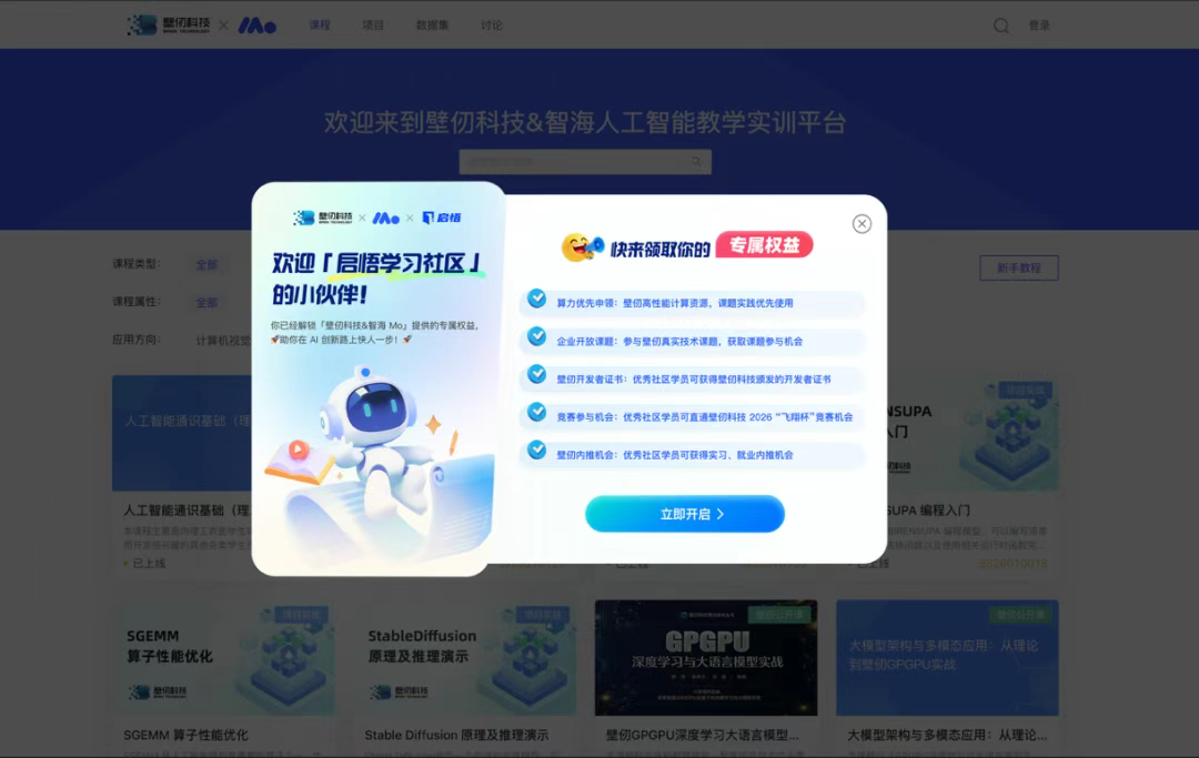 近日,为响应“十五五”规划、落实教育强国战略,在教育部科技司指导下,国家教育开源平台“启悟学习社区”(https://qiwoo.edu.cn)正式上线。作为首批入驻的国产通用GPU领军企业,壁仞科技已在启悟学习社区上线壁仞科技系列公开课、壁仞科技&智海人工智能学习实训平台、人工智能挑战任务,为全国高校师生提供集学习、实践、共创于一体的AI教育新生态。