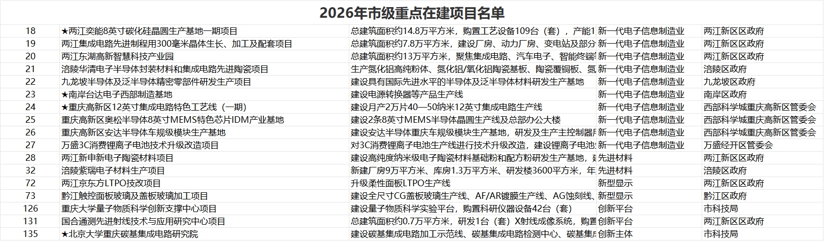 2026年市级重点在建项目名单包括两江奕能8英寸碳化硅晶圆生产基地一期项目、涪陵华清电子半导体封装材料和集成电路先进陶瓷项目、九龙坡半导体及泛半导体精密零部件研发生产项目、重庆高新区12英寸集成电路特色工艺线(一期)、重庆高新区奥松半导体8英寸MEMS特色芯片IDM产业基地、重庆高新区安达半导体车规级模块生产基地。