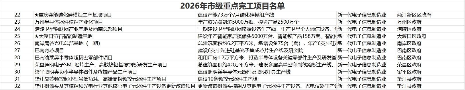 2026年市级重点完工项目名单包括重庆奕能碳化硅模组生产基地项目、万州半导体器件模组产业化项目、巴南奇芯项目、巴南渝莱昇半导体超精密零部件项目、荣昌通明电子SMT贴片生产、高散热铝基覆铜板研发生产项目等。