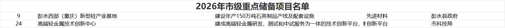 2026年市级重点储备项目名单包括彭水西部(重庆)新型硅产业基地等。