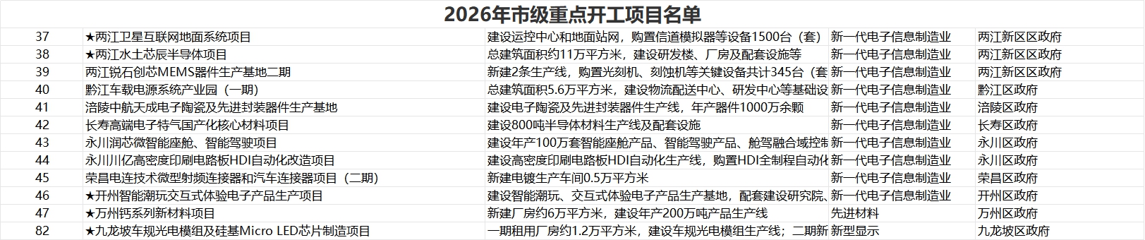 其中,2026年市级重点开工项目包括两江水土芯辰半导体项目、两江锐石创芯MEMS器件生产基地二期、涪陵中航天成电子陶瓷及先进封装器件生产基地、长寿高端电子特气国产化核心材料项目、永川川亿高密度印刷电路板HDI自动化改造项目等。