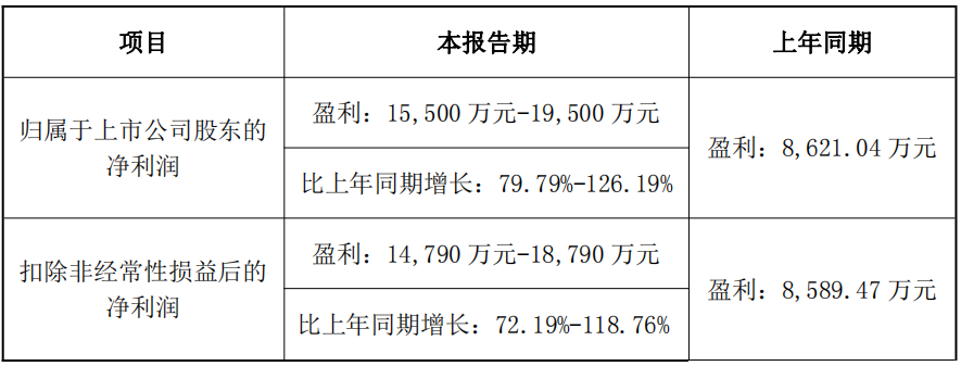 同时,公司预计扣除非经常性损益后的净利润为1.479亿元至1.879亿元,较上年同期的8,589.47万元增长72.19%至118.76%。预计本报告期内非经常性损益对净利润的影响金额约为710万元。