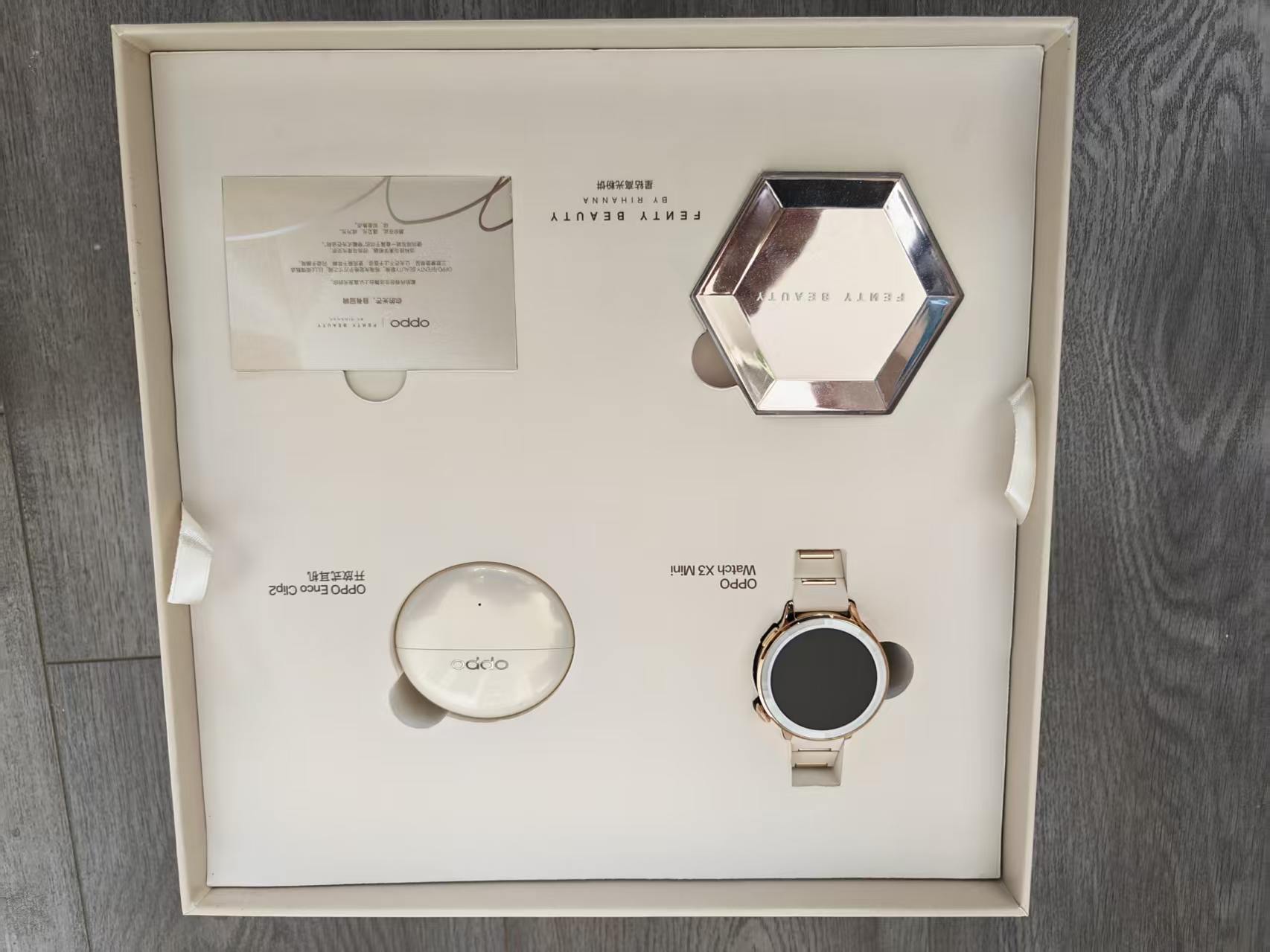 开箱这份鎏金惊喜,OPPO Watch X3 Mini(高光金)与 OPPO Enco Clip2(高光金)两款重磅新品联袂登场,将 “闪耀如金,每一面都高光” 的主张融入方寸设计,既是职场干练的穿搭点睛之笔,也是生活松弛的质感陪伴,让每一位女性都能在日常中自带光芒。FENTY BEAUTY 星钻高光粉饼与印着“你的光芒,自有回响”的寄语卡片,将“高光”的主题贯穿始终。