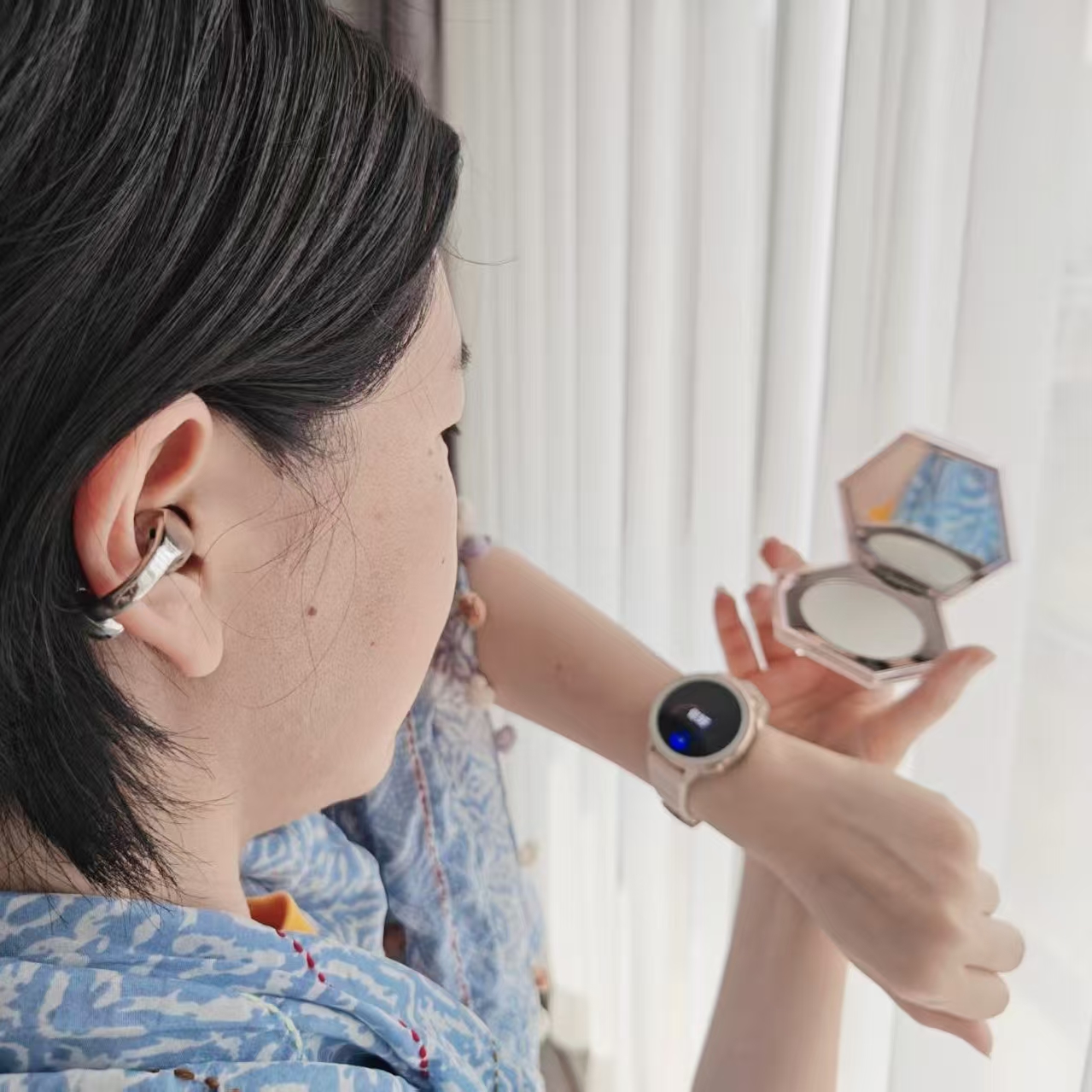 将OPPO Watch X3 Mini 与Enco Clip2一同佩戴,搭配简约的金色系配饰与干净自然的妆容,便是一套完美的高智风职场穿搭。鎏金的光泽相互呼应,既有智性的从容,又有精致的闪耀,让职场的干练与生活的松弛完美融合。而 FENTY BEAUTY 星钻高光粉饼的加入,更是让 “高光穿搭” 形成闭环,从腕间到耳畔,再到面部的精致提亮,每一处细节都诠释着 “我的高光时刻” 的核心内涵。