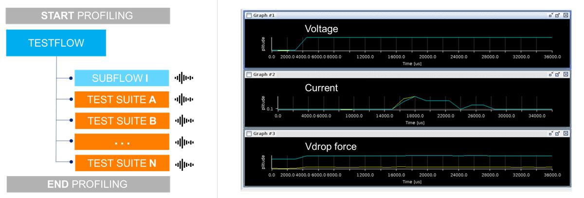 独立ADC 的架构赋予了 XPS256 板卡DC Profiling 同时检测电压/电流/压降的能力,并且真正实现了对测试流程的 后台全覆盖,时间零开销。下图展示了同时对3要素的全流程,无死角记录: