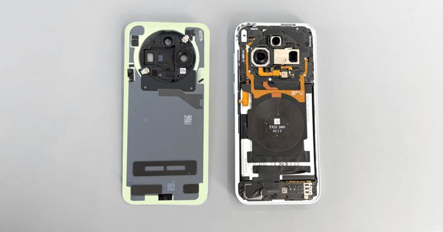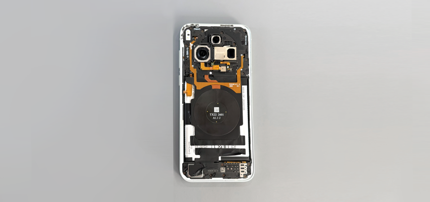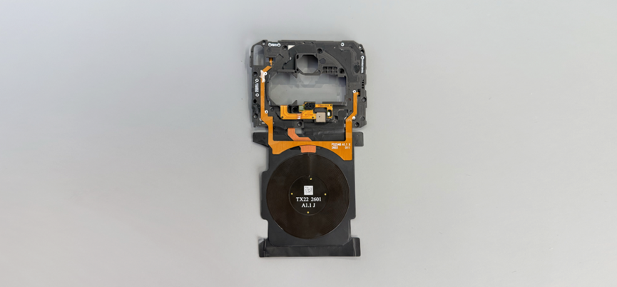 主板支架上主摄开孔周围环绕着规整的 NFC 线圈,布局紧凑有序,保障 NFC 功能稳定传输的同时,不占用机身核心布局空间。无线充电线圈位电池区域。
