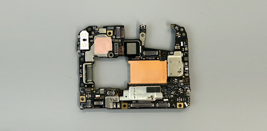 卸下主板剩余的固定螺丝,挑起主板,主板正面集成了多焦段闪光灯,背面贴有多组铜箔散热片,核心芯片对应区域填充了导热硅脂,用于快速导出芯片运行时产生的热量。
