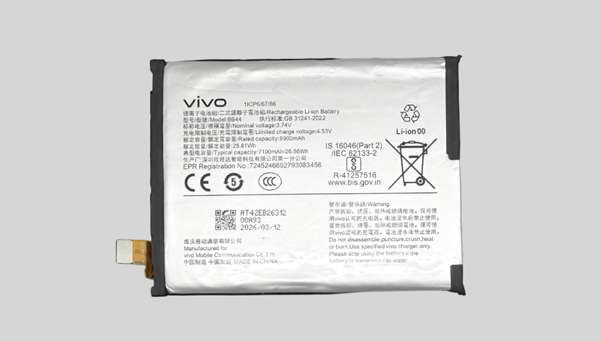 该机采用单电芯双接口方案,内置第四代硅负极 7100mAh 新一代蓝海电池,是 X 系列史上最大容量电池,采用第二代半固态技术,能量密度更高、循环寿命更久;该电池符合 GB 31241-2022 执行标准,多重防护设计保障日常使用安全。