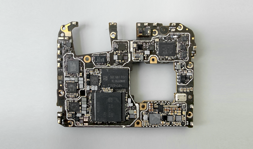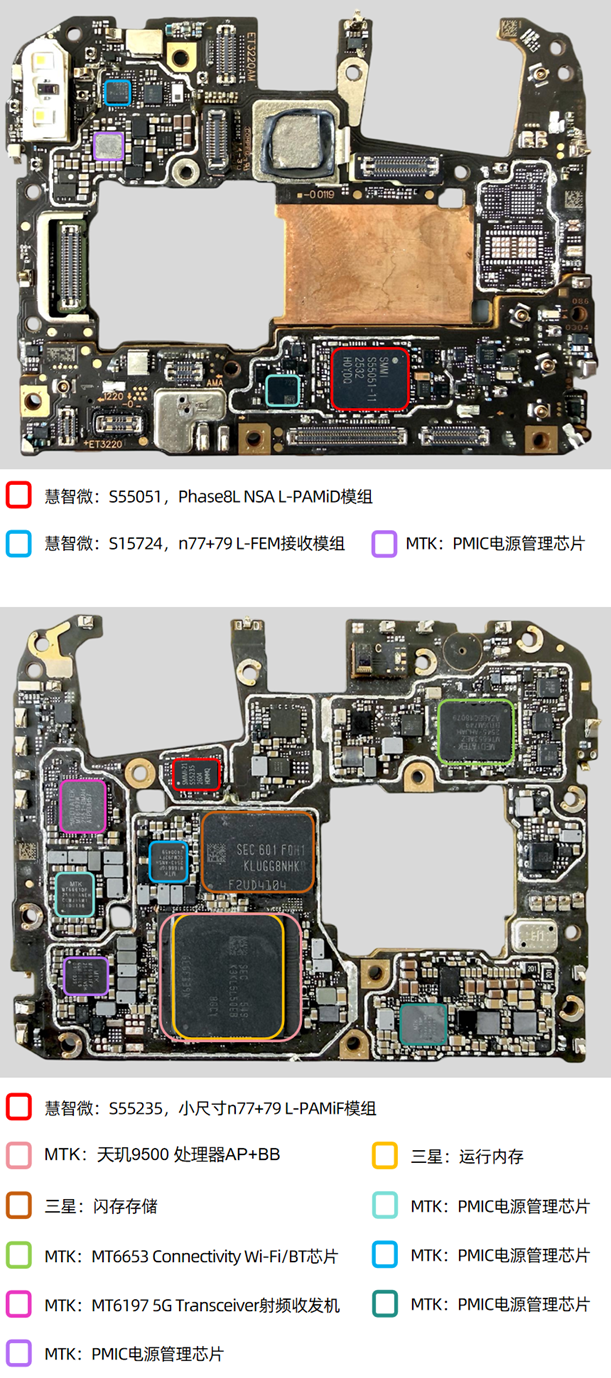 撕开所有铜箔、拆开金属屏蔽罩,清理表面散热材料后,主板上的核心芯片清晰可见。除了联发科、三星等国际芯片供应商外,我们也看到了慧智微等国产芯片供应商的身影,国产芯片的规模化商用,彰显了国内芯片产业的快速发展实力。