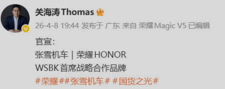 4月8日,荣耀全球首席营销官关海涛在社交媒体宣布,荣耀将与张雪机车开展联名合作,并成为张雪机车在世界超级摩托车锦标赛(WSBK)的首席战略合作品牌。当日,张雪机车创始人张雪还在抖音直播间对此表示感谢,并提及期待获赠荣耀手机。