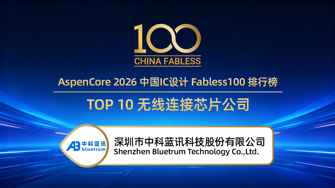 近日,全球领先电子行业媒体集团 ASPENCORE 重磅发布2026 China Fabless 100榜单,深圳市中科蓝讯科技股份有限公司凭借硬核的技术实力、亮眼的经营业绩与强劲的行业影响力,再度荣登TOP 10 无线连接芯片公司榜单!这份荣誉是行业对中科蓝讯2025 年高质量发展成果的高度认可,更是对公司在无线音视频与 AIoT 领域技术引领力的权威印证。