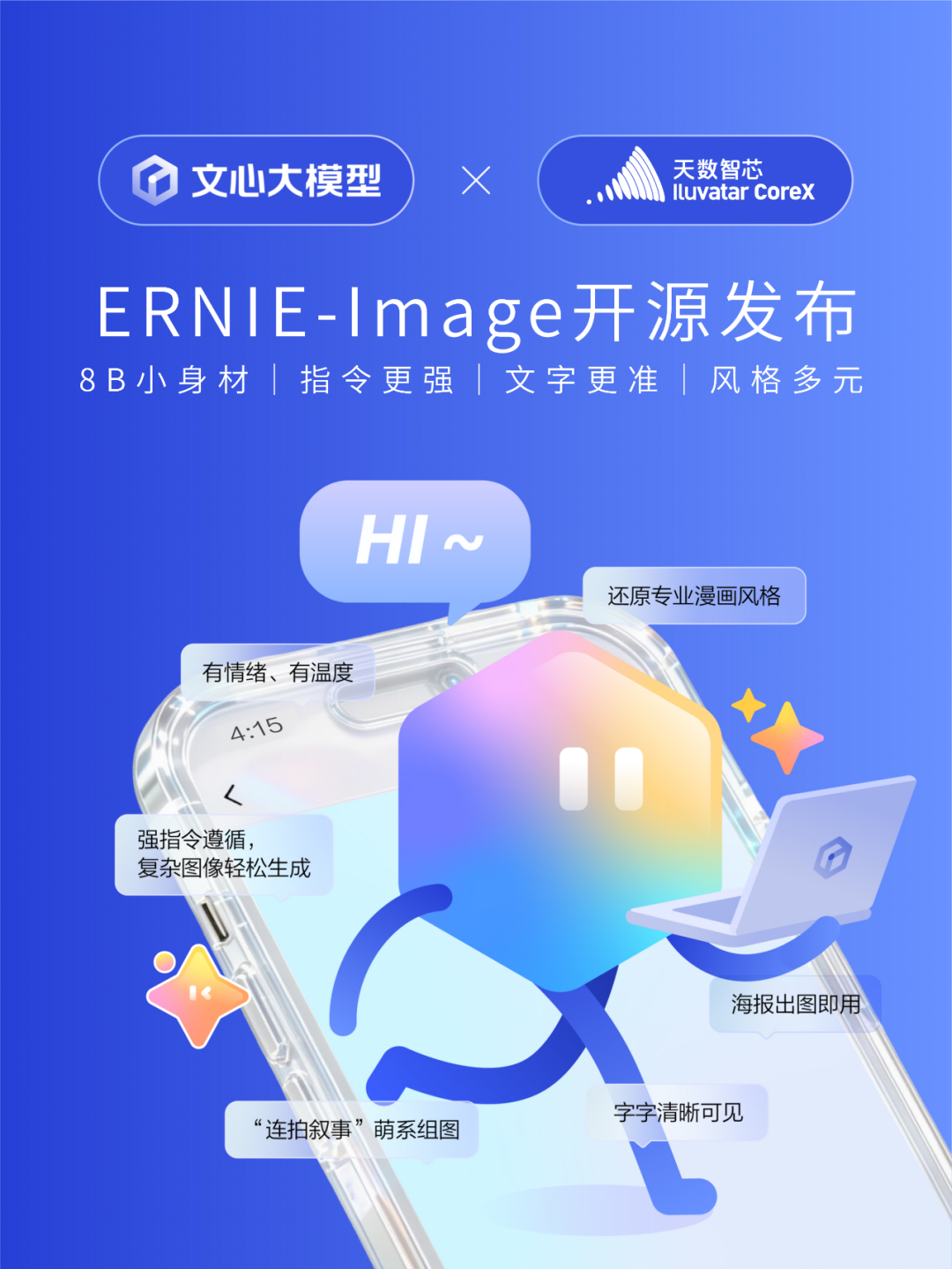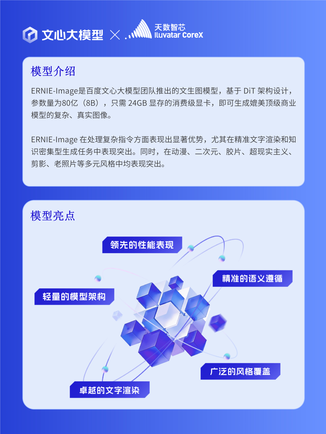 4 月 15 日,百度文心大模型团队正式发布开源文生图模型 ERNIE-Image,凭借 8B 参数量、24GB 消费级显卡即可部署的优势,以及在复杂指令遵循、精准文字渲染、多元风格生成等领域的 SOTA 表现,迅速成为 AIGC 领域焦点。作为百度文心长期深度合作伙伴,天数智芯第一时间完成ERNIE-Image 及 ERNIE-Image Turbo 的 Day 0 原生适配,全系列通用GPU 产品全面支持该模型高效推理,以强大AI算力底座,为这款顶尖开源文生图模型提供开箱即用的高效运行方案,推动国内 AI 软硬件生态深度融合。