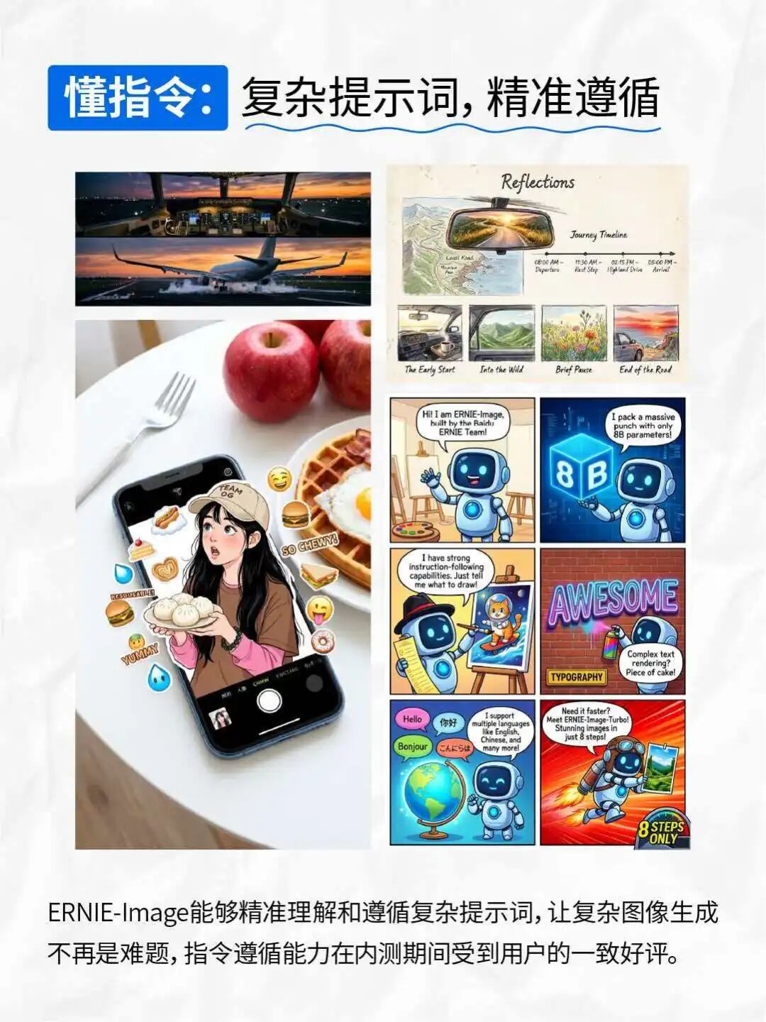 更具意义的是,ERNIE-Image 采用 Apache 2.0 协议开源,模型权重、推理代码同步在 Hugging Face、GitHub 等平台开放,支持开发者在 ComfyUI、AI Studio 等工具中快速体验。从精准文字渲染、知识密集型图像生成,到动漫、二次元、胶片、超现实主义等多元风格创作,再到海报、漫画、分镜等结构化视觉任务,ERNIE-Image均表现卓越,彻底打破“高性能文生图依赖大参数、高门槛算力”的行业桎梏。