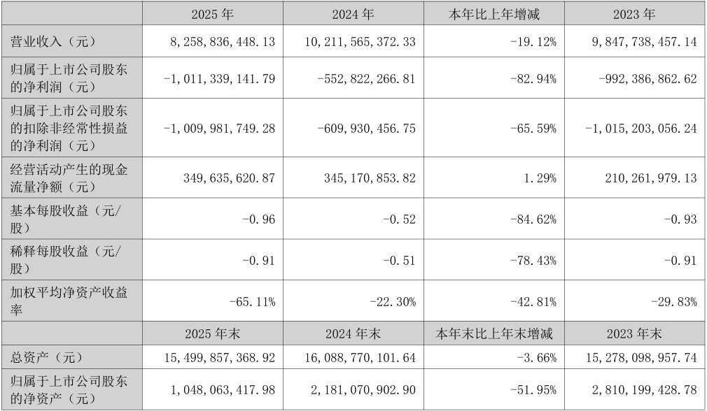 报告显示,2025年公司实现营业收入82.59亿元,较上年同期的102.12亿元下降19.12%;归属于上市公司股东的净利润为-10.11亿元,上年同期为-5.53亿元,亏损扩大82.94%;扣除非经常性损益后的净利润为-10.1亿元,上年同期为-6.1亿元,亏损扩大65.59%。