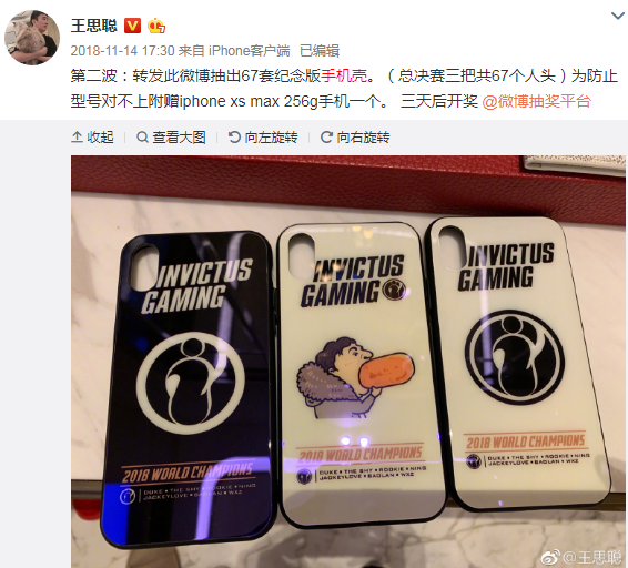 “转发此微博抽出67套纪念版手机壳。(总决赛三把共67个人头)为防止型号对不上附赠iphone xs max 256g手机一个。 三天后开奖 @微博抽奖平台 ”。