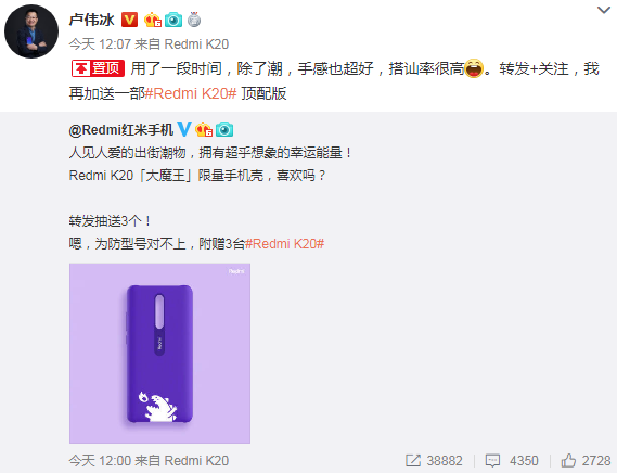 对于Redmi也玩“抽手机壳送手机”的操作,小米集团副总裁、红米Redmi 品牌总经理卢伟冰表示支持,他转发微博说: