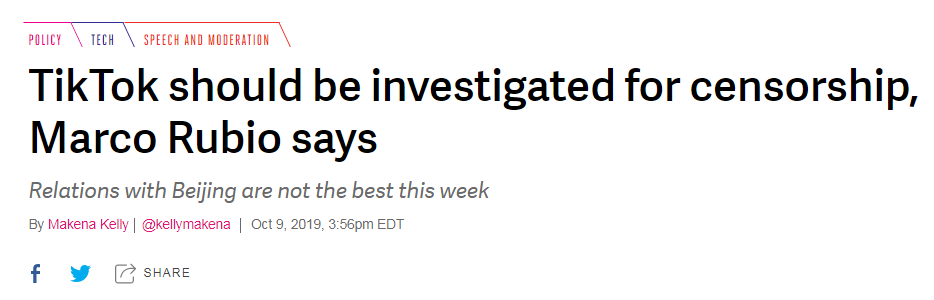 此事当然少不了“反华急先锋”卢比奥的戏份。他早在10月6日就开始行动,要求美国外国投资委员会,对字节跳动2017年的musical.ly收购案重新审查。