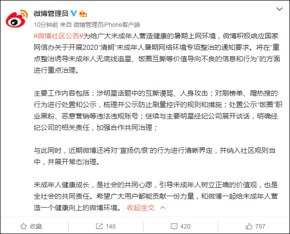 据@微博管理员 7月18日消息,为给广大未成年人营造健康的暑期上网环境,微博积极响应国家网信办关于开展2020“清朗”未成年人暑期网络环境专项整治的通知要求。将在“重点整治诱导未成年人无底线追星、饭圈互撕等价值导向不良的信息和行为”的方面进行重点治理。
