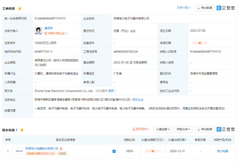 近日,珠海格力电子元器件有限公司成立,法定代表人为董明珠,注册资本1亿元,经营范围包含电子元器件制造;电子元器件批发;电力电子元器件制造;电力电子元器件销售。该公司由格力电器100%控股。