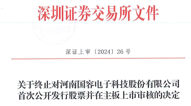 近日,深交所披露了关于终止对河南国容电子科技股份有限公司(简称:国容股份)首次公开发行股票并在主板上市审核的决定。