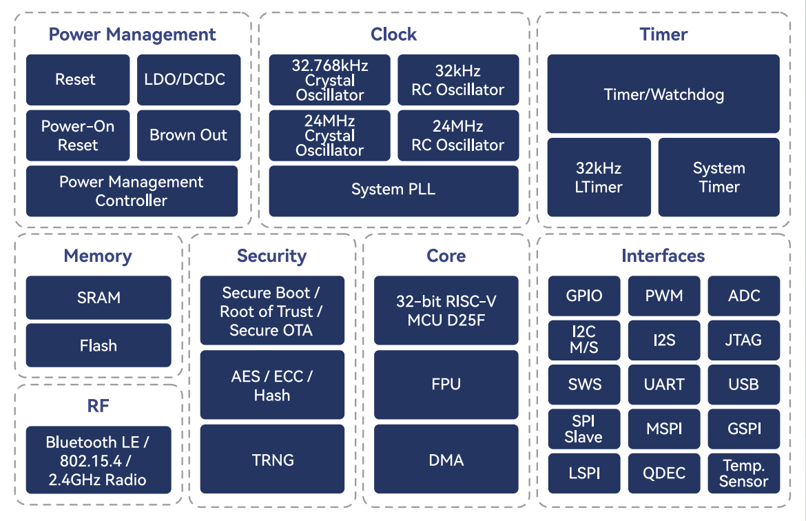 除了低功耗和先进的蓝牙技术,TL721X还支持多种无线协议,包括蓝牙低功耗、Zigbee、Thread、Matter以及2.4GHz私有协议等。这种多协议支持能力使得TL721X能够无缝连接到不同的物联网生态系统中,满足智能家居、智能穿戴、智能医疗等多种应用场景的需求。其高性能的硬件配置,包括32位RISC-V MCU、主频高达240MHz、DSP/FPU单元、512KB SRAM以及2MB Flash存储,使得TL721X能够高效处理复杂的计算任务,支持AI算法的运行,为智能设备提供更强大的处理能力。