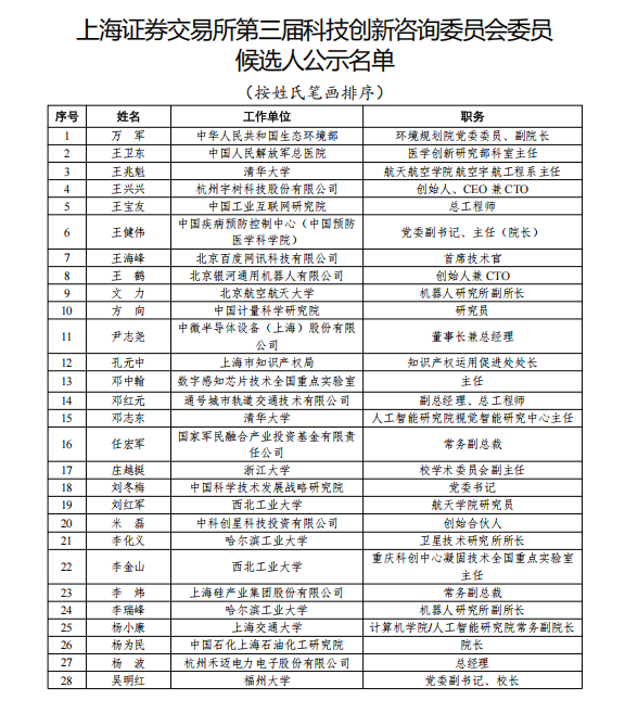 9月12日,上海证券交易所发布公告,公示第三届科技创新咨询委员会委员候选人名单。