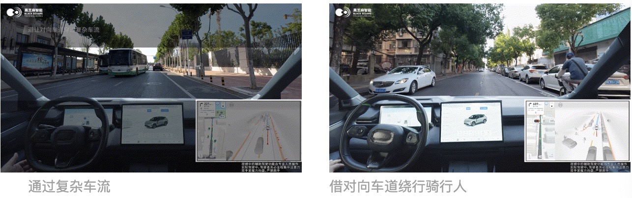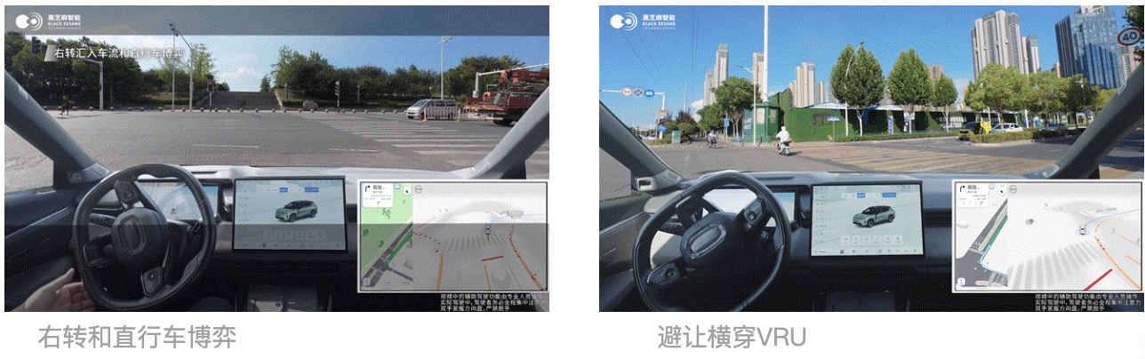 黑芝麻智能自研辅助驾驶方案也实现了右转礼让直行车、避让横穿VRU、避让对向车道通过复杂车流、避让直行/右转冲出骑行人、近距离加塞避让、避让侵占道路车辆等功能。