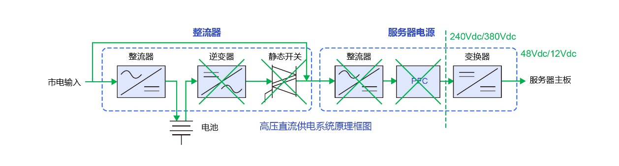 HVDC(High-Voltage Direct Current)是一种利用直流电进行大容量、长距离电力传输的技术。顾名思义,相较于前述的UPS+PSU输出DC48V/12V给服务器主板,HVDC可以输出更高等级的直流母线电压如DC240V,再通过DC-DC的电源模块将DC240V电压降压为DC48V,且将传统UPS的铅蓄电池替换成锂电池BBU,并取消了UPS逆变和整流的环节,大大提升了电力传输的转化效率。
