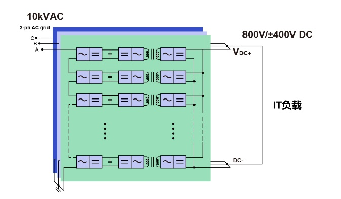 另一路由市电10KVAC通过SST固态变压器一部到位,输出800VDC;