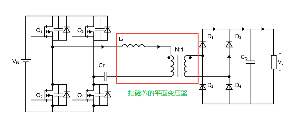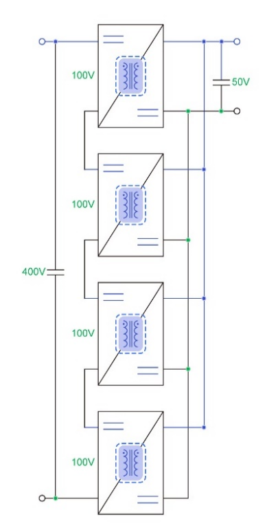 采用HVDC拓扑架构后输出母线电压出现了240VDC、336VDC、400VDC,甚至800VDC,则在这些高压直流和48V/12VDC之间还需要一个直流降压转换的模块,业内目前较为普遍的是多个扣磁芯的LLC的平面变压器级联的拓扑,如下以DC400V—DC50V为例: