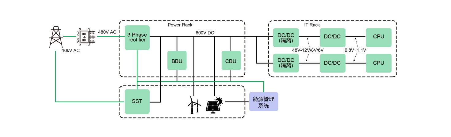 SST可以实现从电网10KVAC直接一步到位转换为480VAC电压,再通过PSU升压为高达800V/±400VDC的直流母线电压给到IT计算机柜单元,其占用的体积进一步减小,损耗进一步降低,实现更高的转化效率。