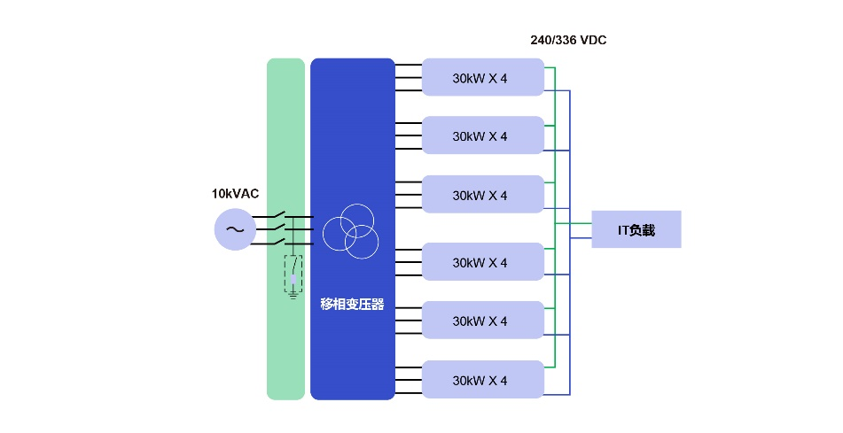 巴拿马电源是一种将交流10kV直接转换为直流240V/336V的一体化供电系统,其名称灵感来源于巴拿马运河“缩短航程”的理念,旨在通过优化供电链路减少能量转换环节,提升整体效率,其主要优势在于:将10kVAC中压配电、移相变压器、整流模块、直流输出等环节集成于一体,省去传统低压配电和冗余设备,大大降低占用体积,提升转换效率。