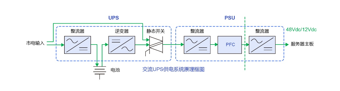 其中UPS由整流、逆变和静态开关三部分组成,正常情况下市电直连静态开关为PSU供电,同时通过整流器为备用电池充电;当市电出现故障时,则备用电池中储存的电能通过逆变器逆变为PSU提供短时间供电,以确保数据不会丢失,主路再次接管供电。