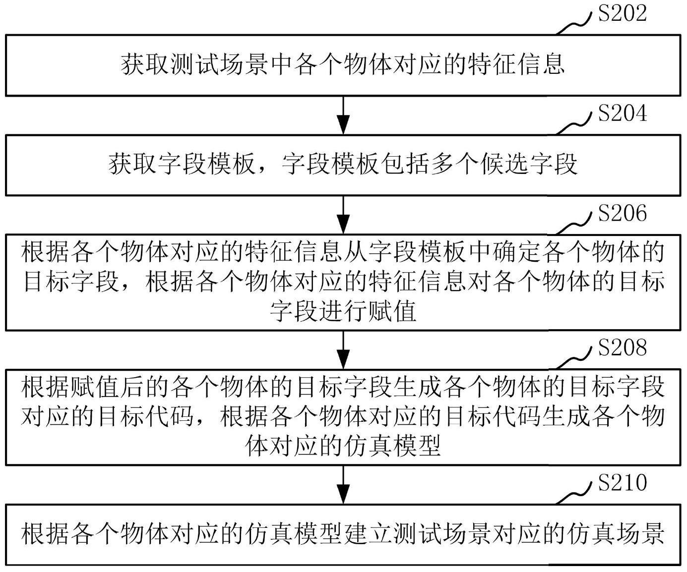 一种测试场景仿真方法,包括:获取测试场景中各个物体对应的特征信息;获取字段模板,字段模板包括多个候选字段;根据各个物体对应的特征信息从字段模板中确定各个物体的目标字段,根据各个物体对应的特征信息对各个物体的目标字段进行赋值;根据赋值后的各个物体的目标字段生成各个物体的目标字段对应的目标代码,根据各个物体对应的目标代码生成各个物体对应的仿真模型;根据各个物体对应的仿真模型建立测试场景对应的仿真场景。