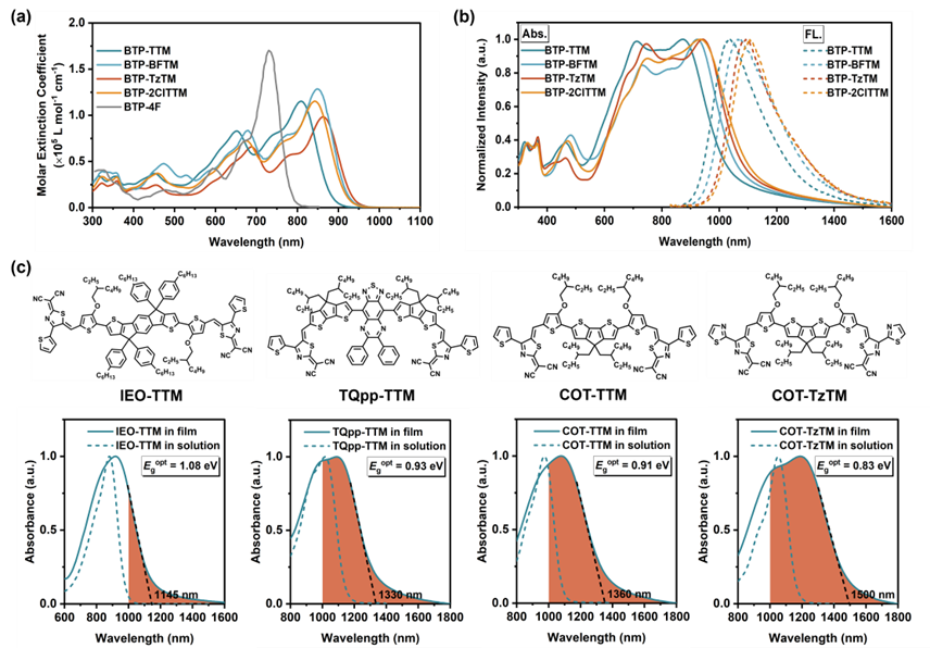 得益于新合成方法,团队成功将呋喃、苯并呋喃、噻唑等杂芳环结构引入TM单元,不仅显著提升了材料的电子亲和能,并通过巧妙的分子内非共价键作用(如S…H, O…H)锁定了分子的共平面构象。所制备的材料表现出优异的光吸收和发射性质,其中基于噻唑取代的COT-TzTM分子在薄膜状态下的光学带隙低至0.83 eV,吸收边缘深入1500 nm的SWIR区域(图2)。