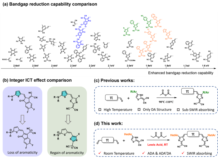 SWIR(1000-3000 nm)光电子技术在现代科技领域,如生物医学成像、无损检测、环境监测、夜视与安防等,具有极其重要的应用前景。然而,目前该波段的核心光电子器件主要依赖于昂贵的无机半导体材料(如III-V族化合物),其制备成本高且质地坚硬,难以满足柔性、可穿戴设备的发展需求。开发高性能超窄带隙的有机半导体材料被视为实现下一代低成本、柔性SWIR光电子技术的关键,但材料结构体系的匮乏,以及相应高效合成方法的缺失,严重制约了其创新发展。