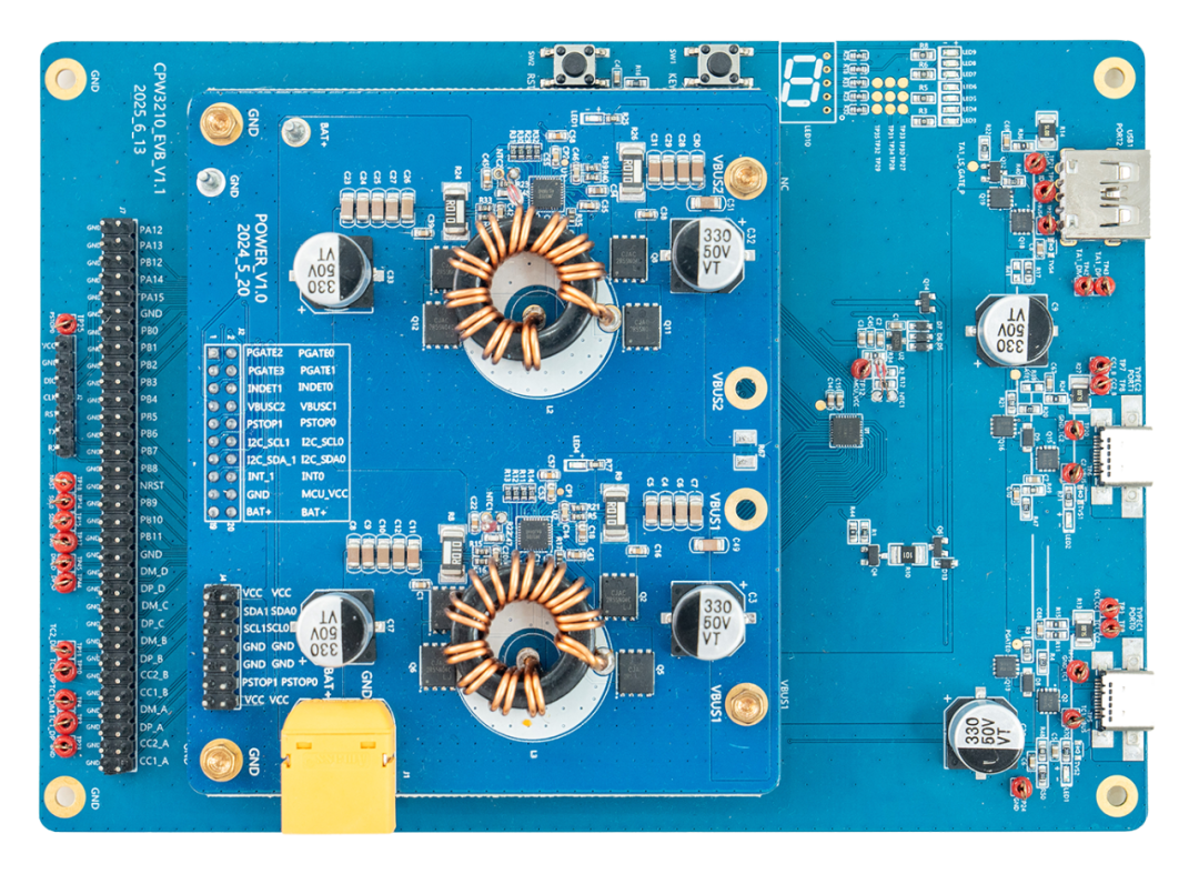 在该架构中,CPW3210可实现2C1A三端口控制,单口充放电功率最高支持140W,多口输出可自动调节为5V模式,并内置库仑计电量算法,支持188数码管电量显示。该方案协议覆盖全面,支持Type-C口免拆机固件升级,极大方便后期维护与功能迭代。