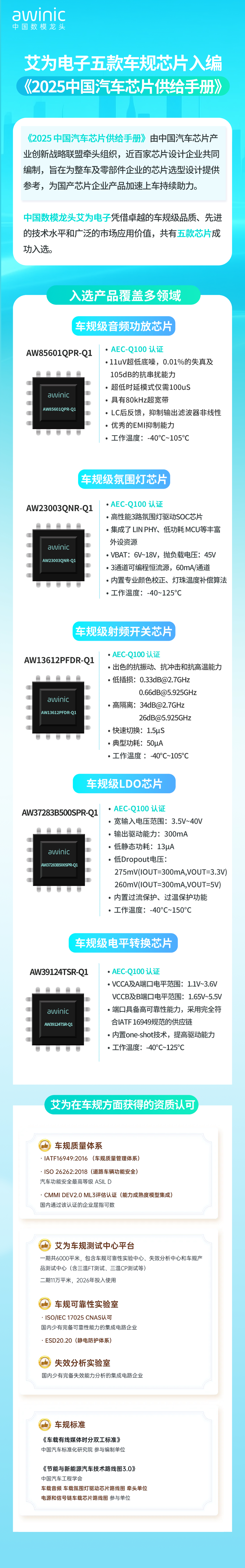 艾为电子获评国家企业技术中心、音频制造业单项冠军企业、国家知识产权优势企业,国家高新区上市公司创新百强榜,上海市创新型企业总部、上海市质量金奖、上海市级设计创新中心、上海市智能音频芯片技术创新中心、上海硬核科技企业TOP100榜单等资质荣誉。