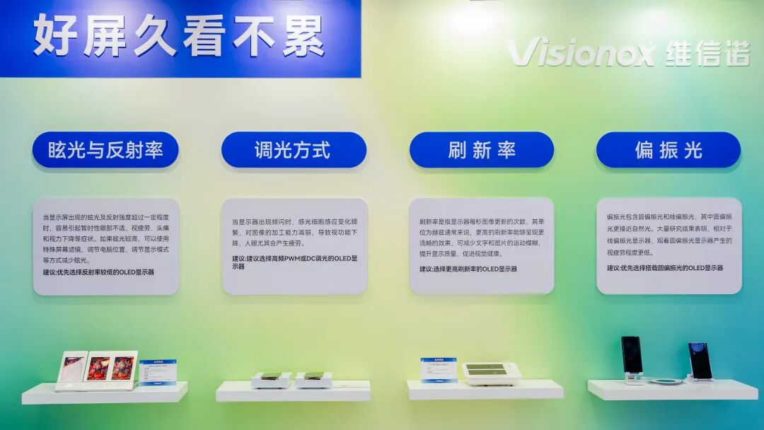 用眼健康是消费者普遍关心的问题,维信诺拥有行业最全、最领先的调光方案及系列护眼方案。现场,维信诺展示了全球领先的4320Hz超高频PWM调光、全DC调光、全球首款低反射COE柔性AMOLED技术以及圆偏振光等护眼好技术。此外,维信诺还带来系列低功耗、高画质创新技术,包括全球首款LTPS 20Hz手机低刷解决方案、高效率pTSF器件柔性AMOLED解决方案、全氧化物柔性AMOLED技术等。