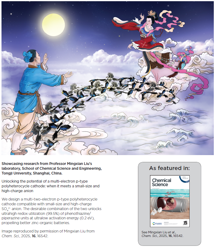 同济大学化学科学与工程学院刘明贤教授团队长期致力于高效储能材料研究并应用于新能源电池,课题组近期设计了多电子杂环p型有机正极材料,实现了高电荷-小尺寸SO42−阴离子低反应能垒氧化还原反应和哌嗪/吩噻嗪位点的高效利用,有效解决了当前p型有机材料存在的问题,构建了高容量、高能量密度和长循环寿命的锌-有机电池。相关成果以“Unlocking the potential of a multi-electron p-type polyheterocycle cathode:when it meets a small-size and high charge anion”为题发表于国际知名期刊《化学科学》(Chemical Science),并被编辑遴选为封面论文(Inside Back Cover)。