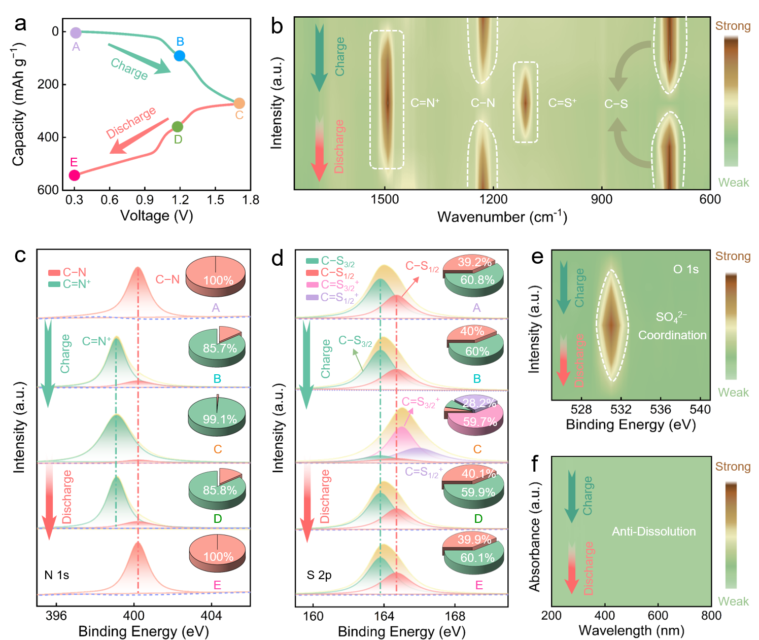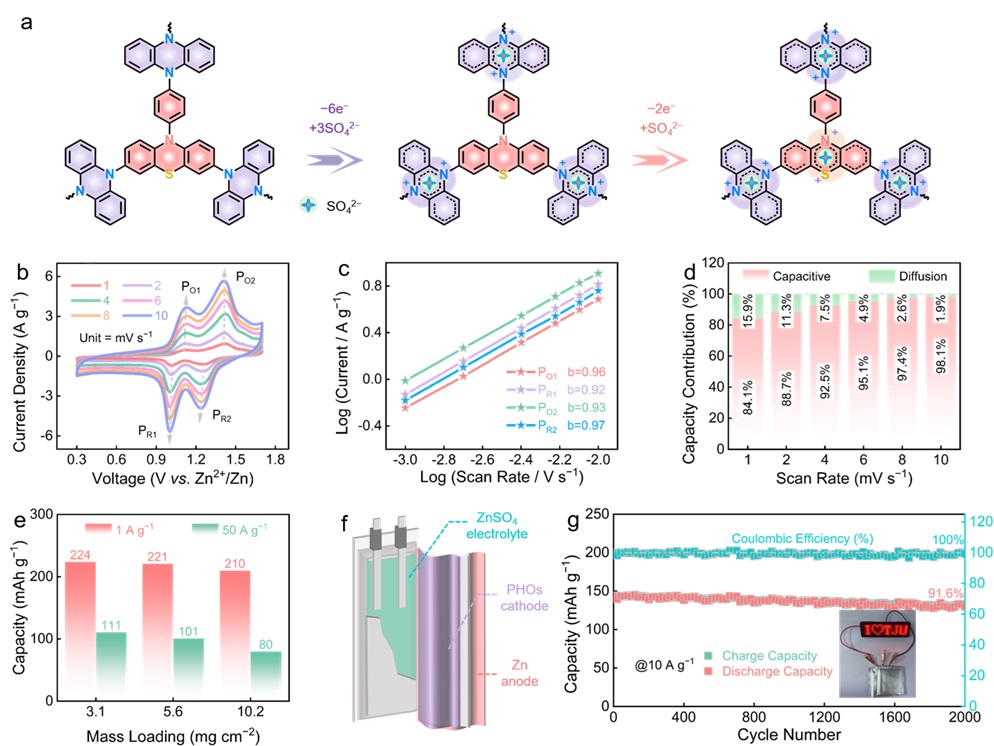 异位光谱和理论计算研究表明,哌嗪/吩噻嗪作为PHOs正极的双p型电活性中心,与小尺寸和高电荷的SO42−电荷载体反应,引发了稳定和快速的两步八电子氧化还原电荷存储过程。